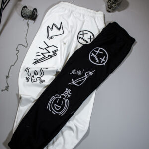 BLACK SWEATPANTS WITH WHITE PRINTS ON BOTH SIDES.