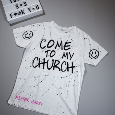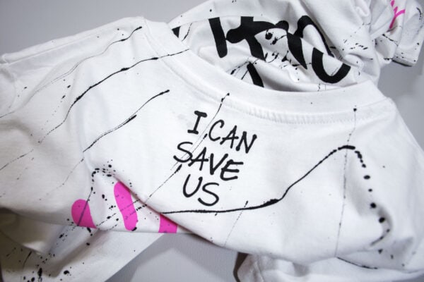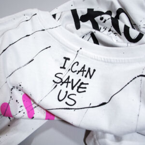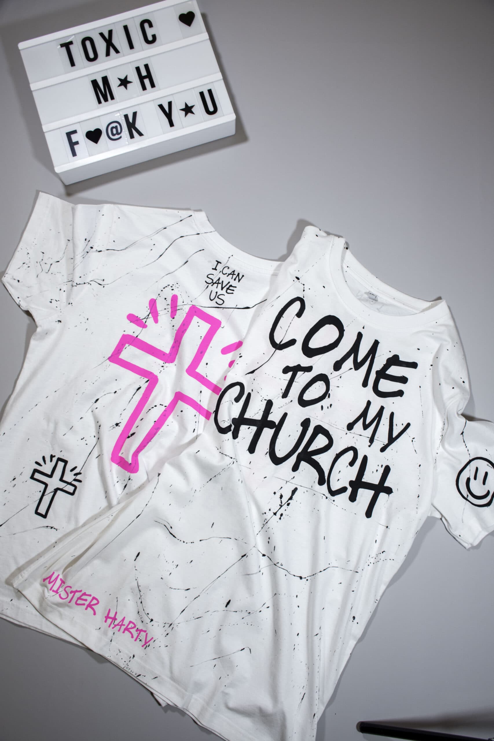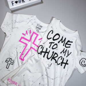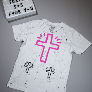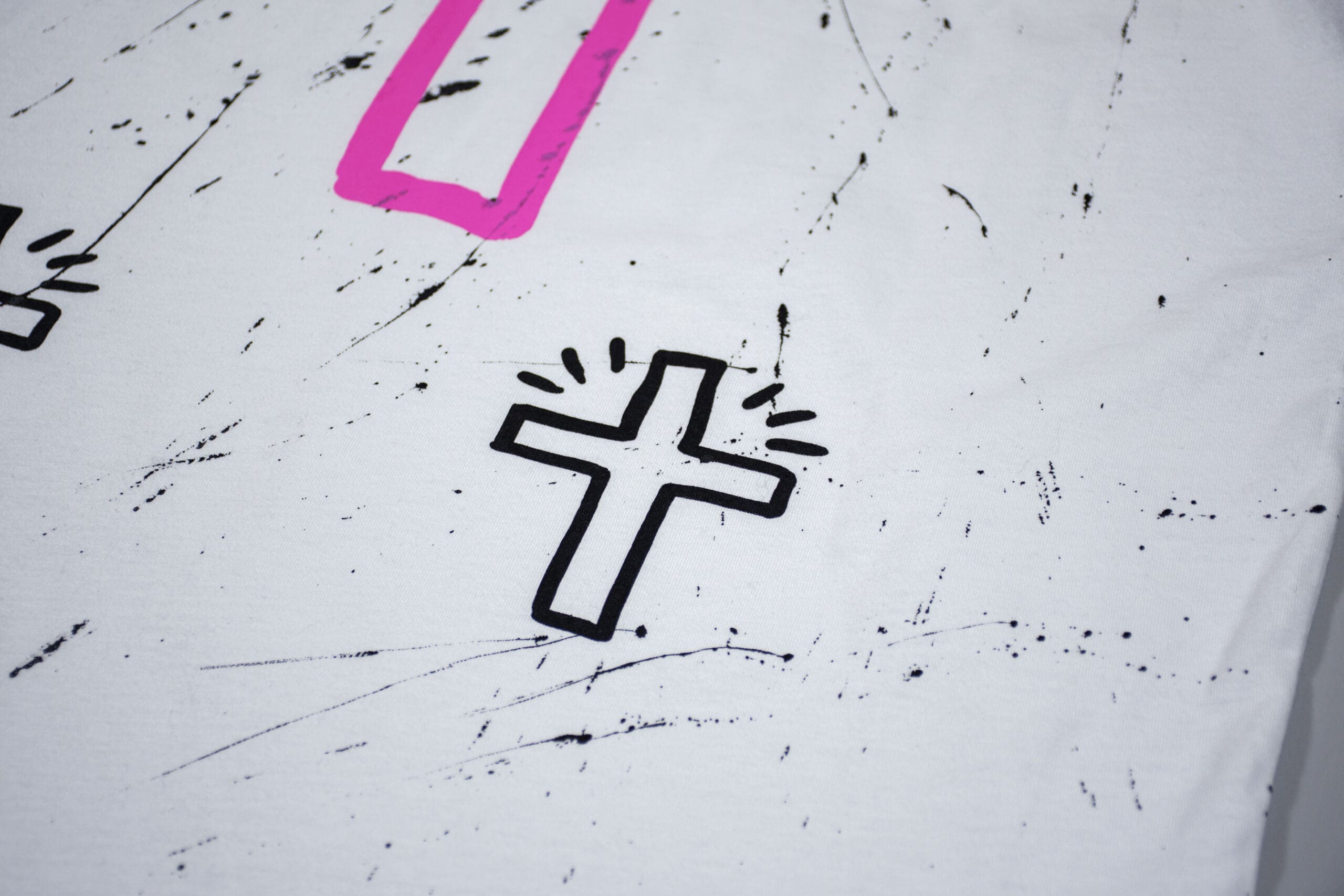 WHITE T SHIRT WITH BLACK AND PINK PRINTS AND HAND PAINTINGS.