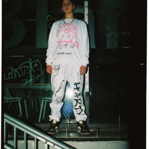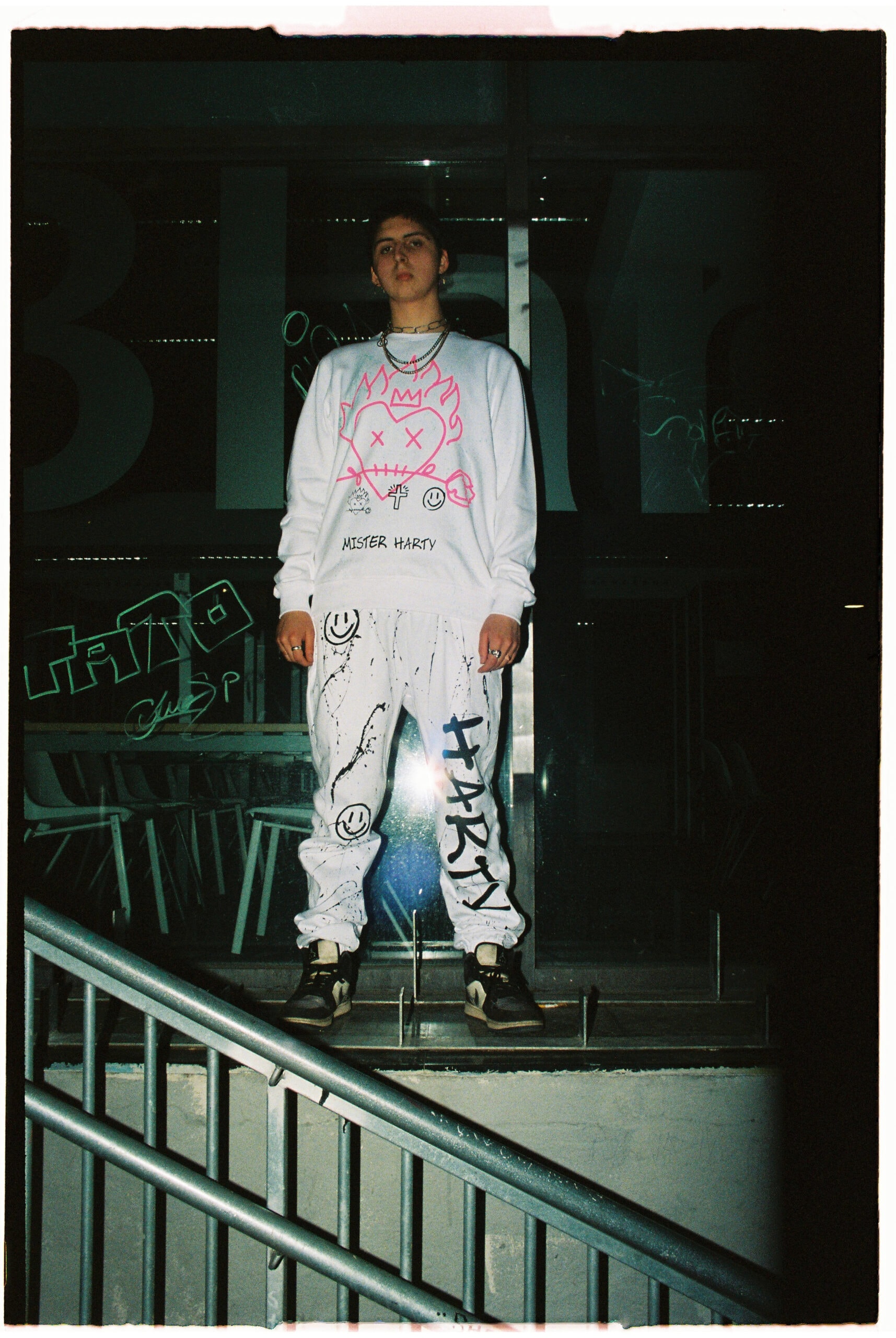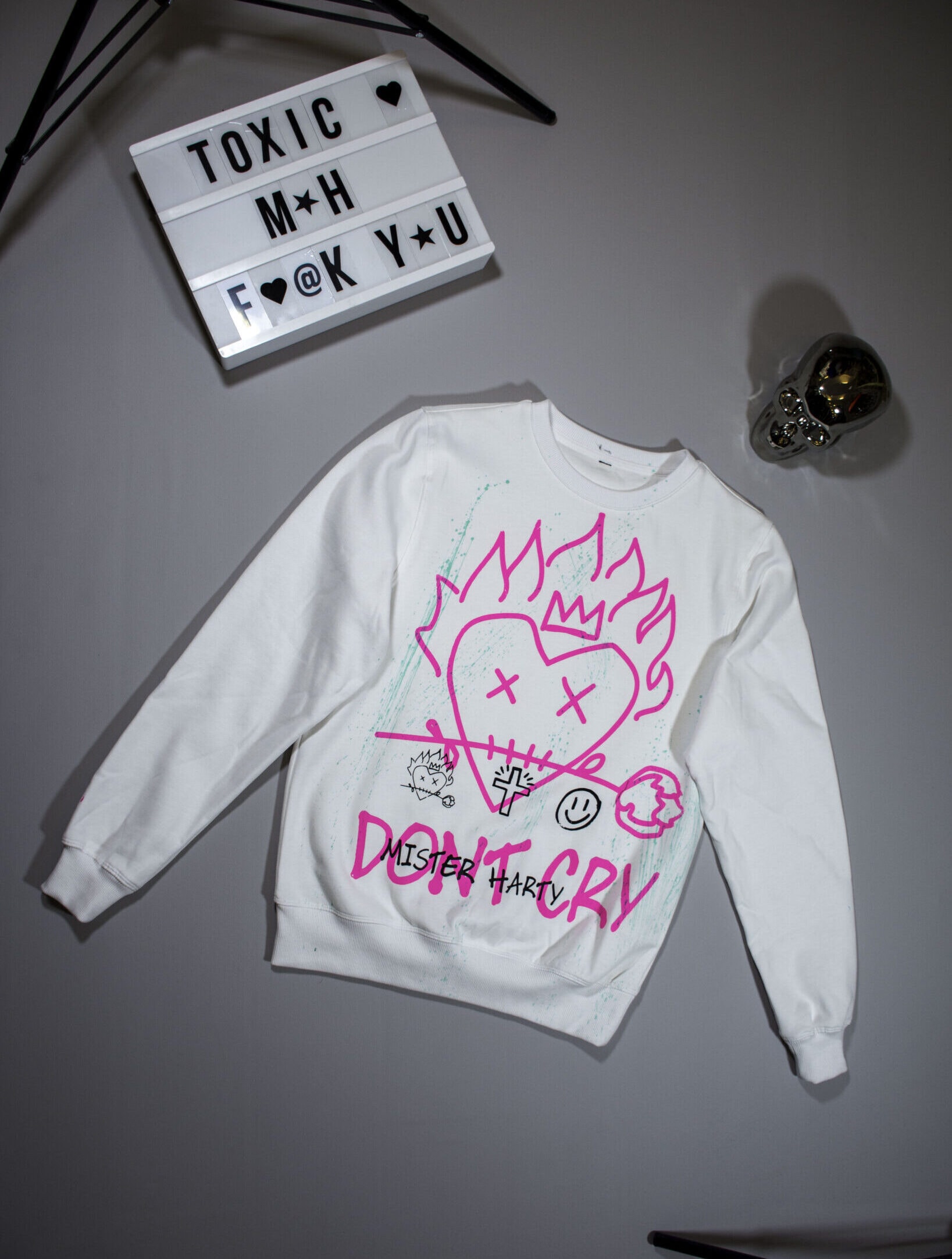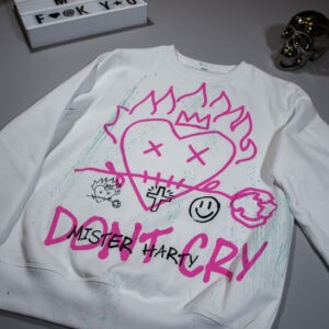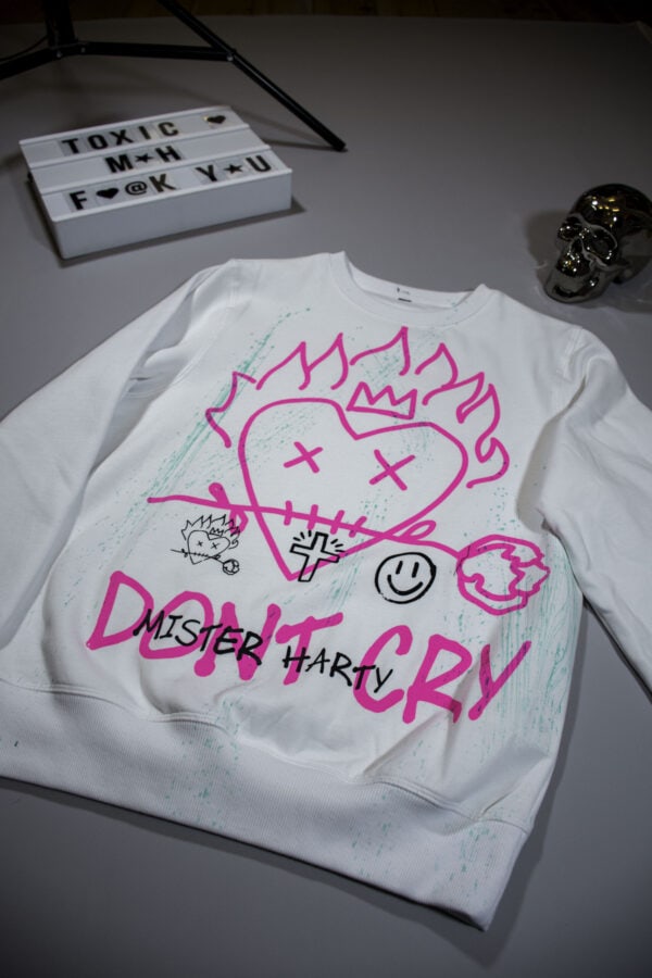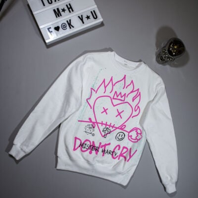 WHITE CREWNECK WITH COLOR PRINTS AND HAND PAINTINGS.